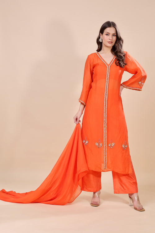 Orange Organza Embroidered Kurta Set (Sample)